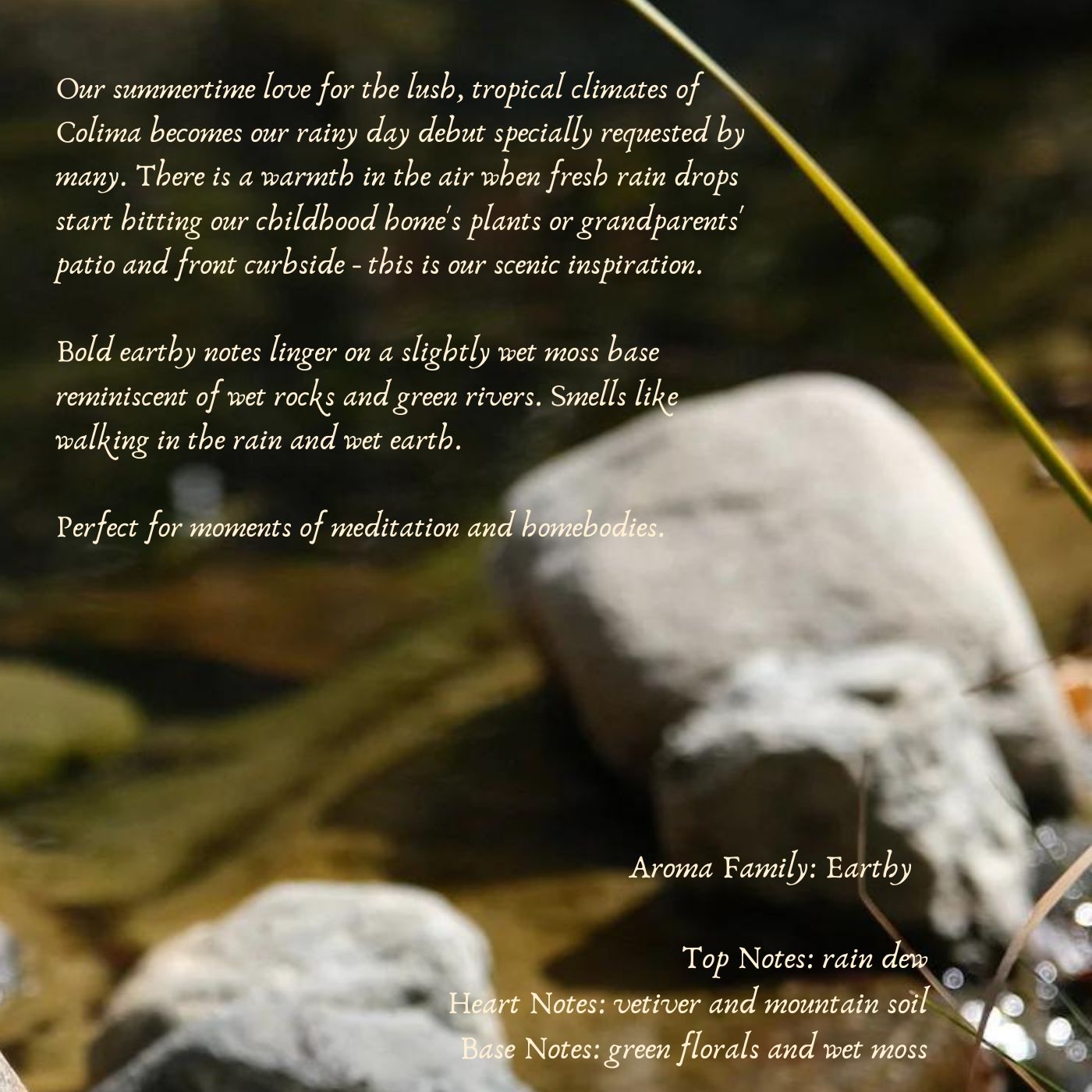 Our love for the lush, tropical climates of Colima becomes our rainy day debut specially requested by many. There is a warmth in the air when fresh rain drops start hitting our childhood home's plants or grandparents' patio and front curbside - this is our scenic inspiration.