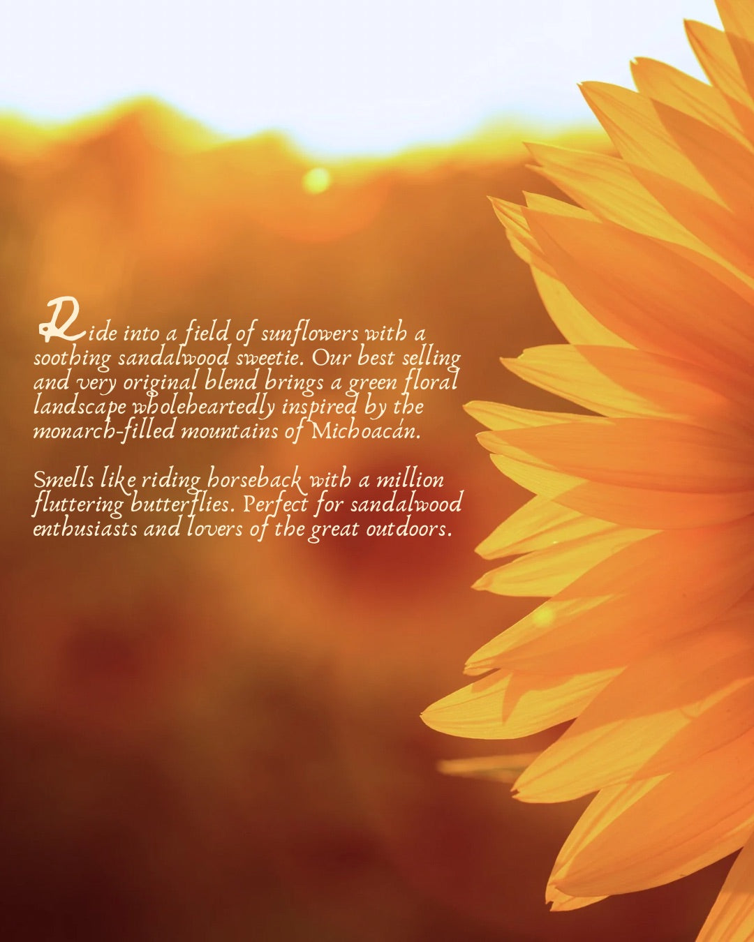 Ride into a field of sunflowers with a soothing sandalwood sweetie. Our best selling and very original blend brings a green floral landscape wholeheartedly inspired by the monarch-filled mountains of Michoacán.